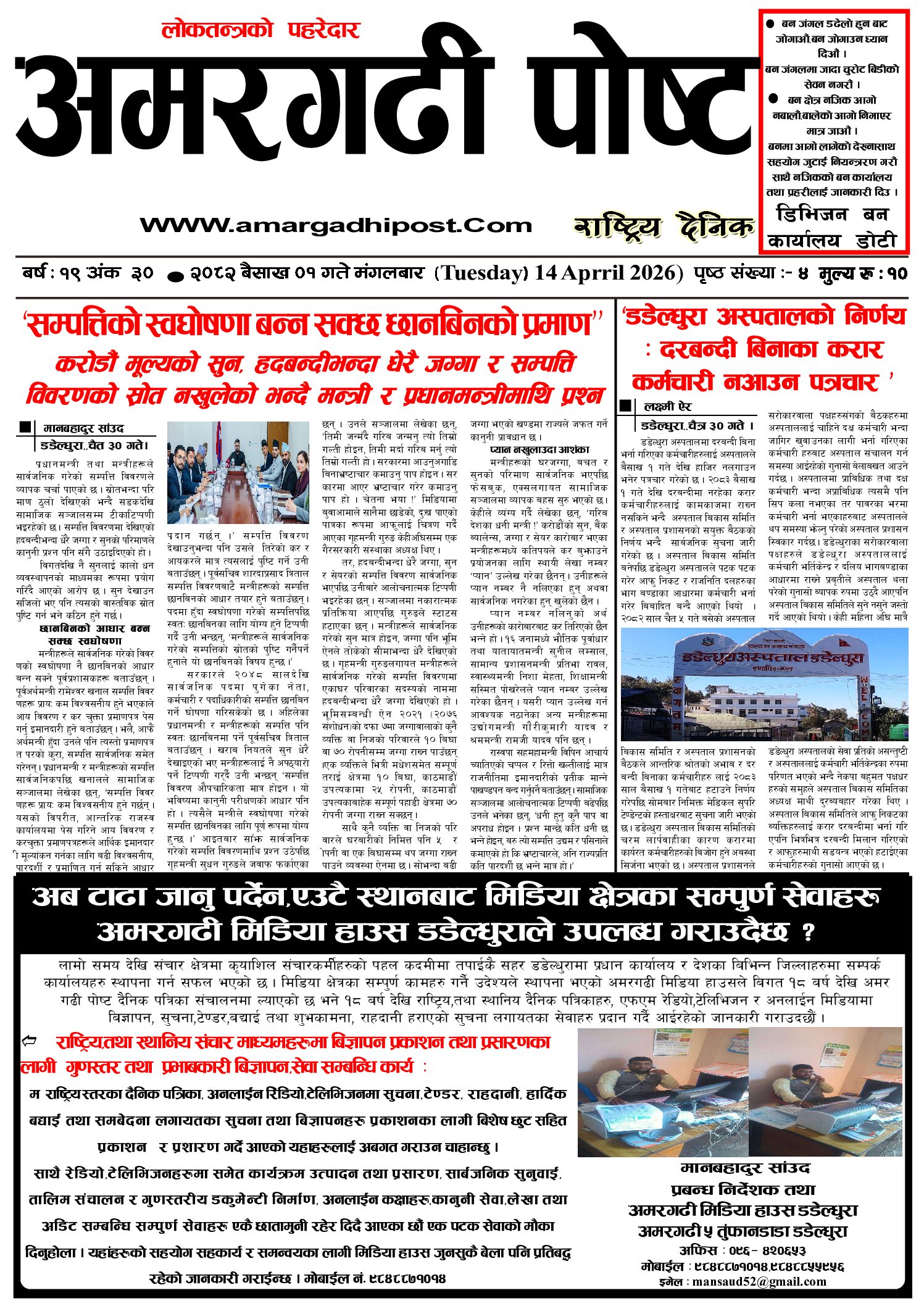 Amargadhi post dainik 2083-01-01 प्रकाशित गर्ने : अमरगढी पाेष्ट प्रकाशित मिति : २०८३ बैशाख १, मंगलवार १७:३१ 9 0